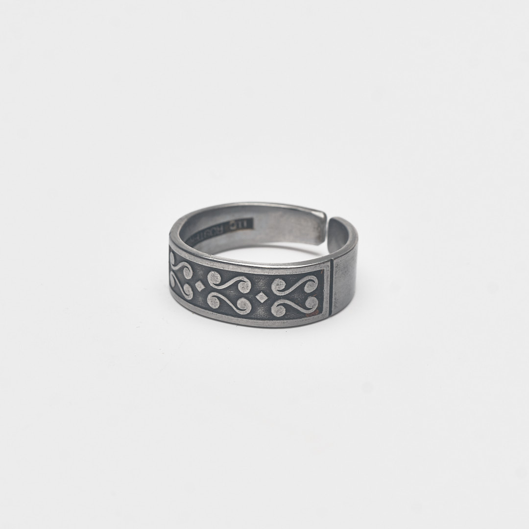 Edelstahlring mit geschwungenen Ornamenten.