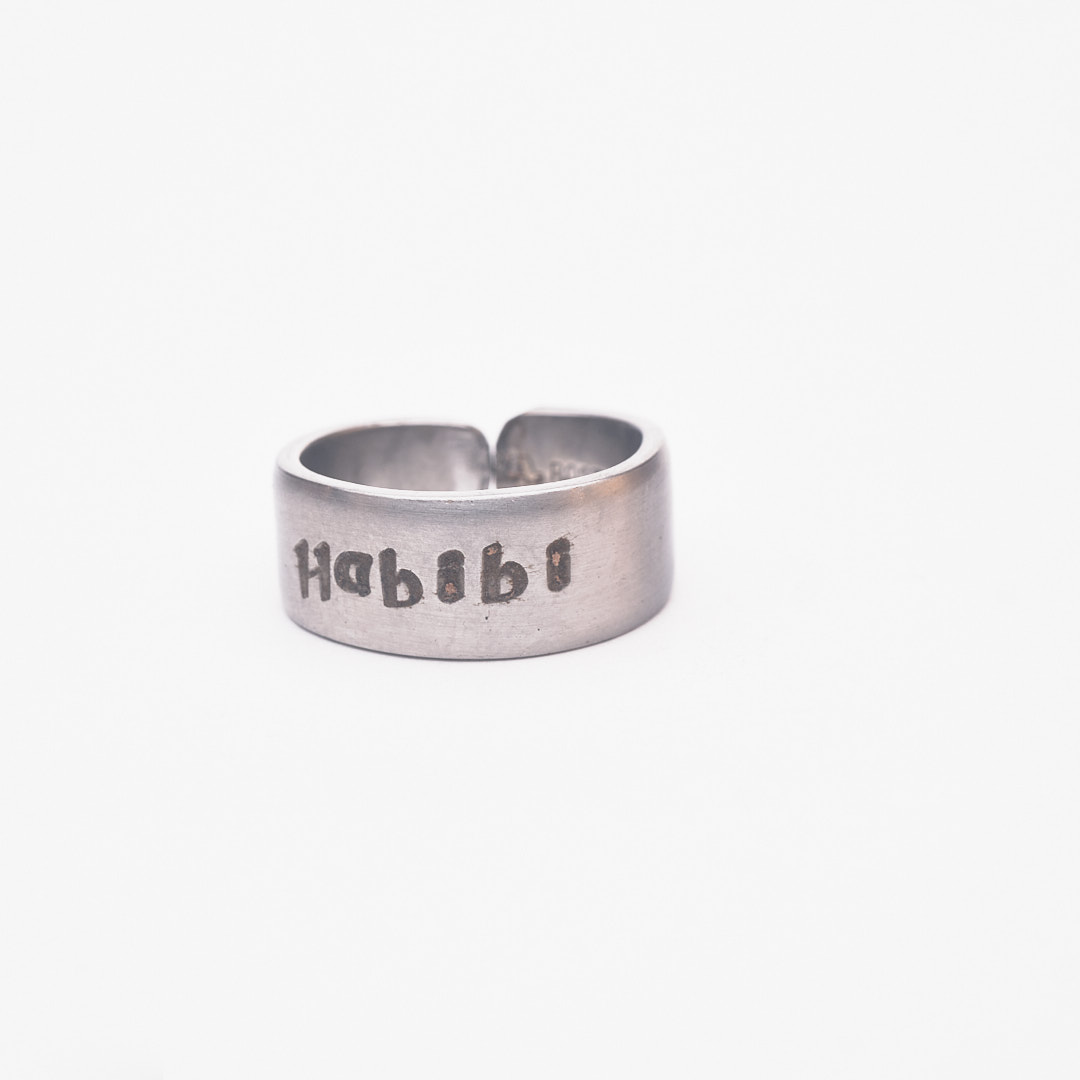 Edelstahl Ring mit dem Schriftzug Habibi, was auf Arabisch so viel wie „mein Geliebter“, von Habib „Geliebter“, auch als Synonym für „Freund“ oder „Liebling“ gebraucht wird. Es ist sowohl ein arabischer und persischer Familienname als auch in der Jugendsprache die Bezeichnung für eine geliebte männliche Person oder (Anrede für) eine Person, mit der man in Freundschaft verbunden ist.
