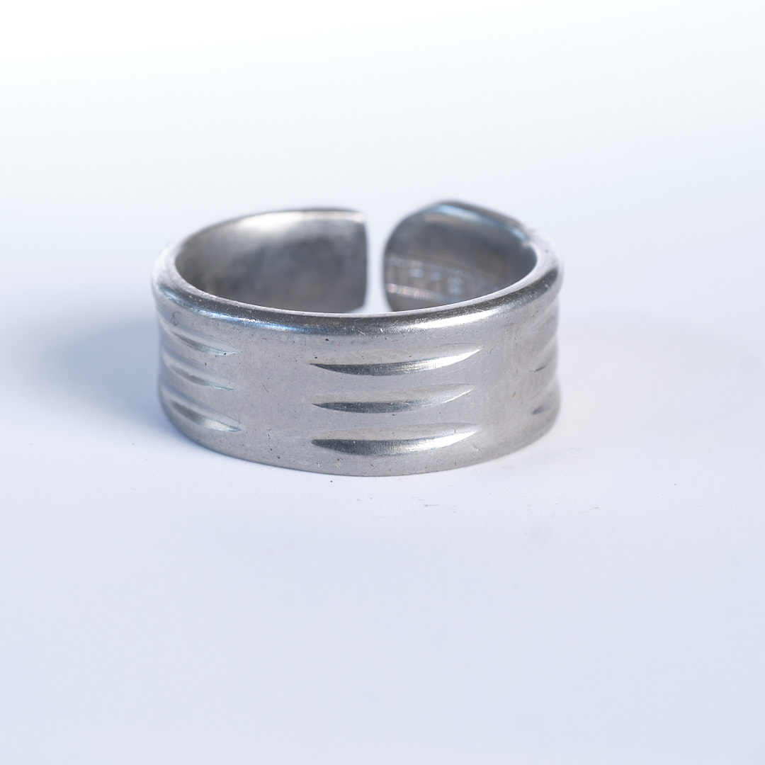 Wunderschöner Edelstahl Ring mit langen Linien, symmetrisch in einem Dreierblöcken Relief.